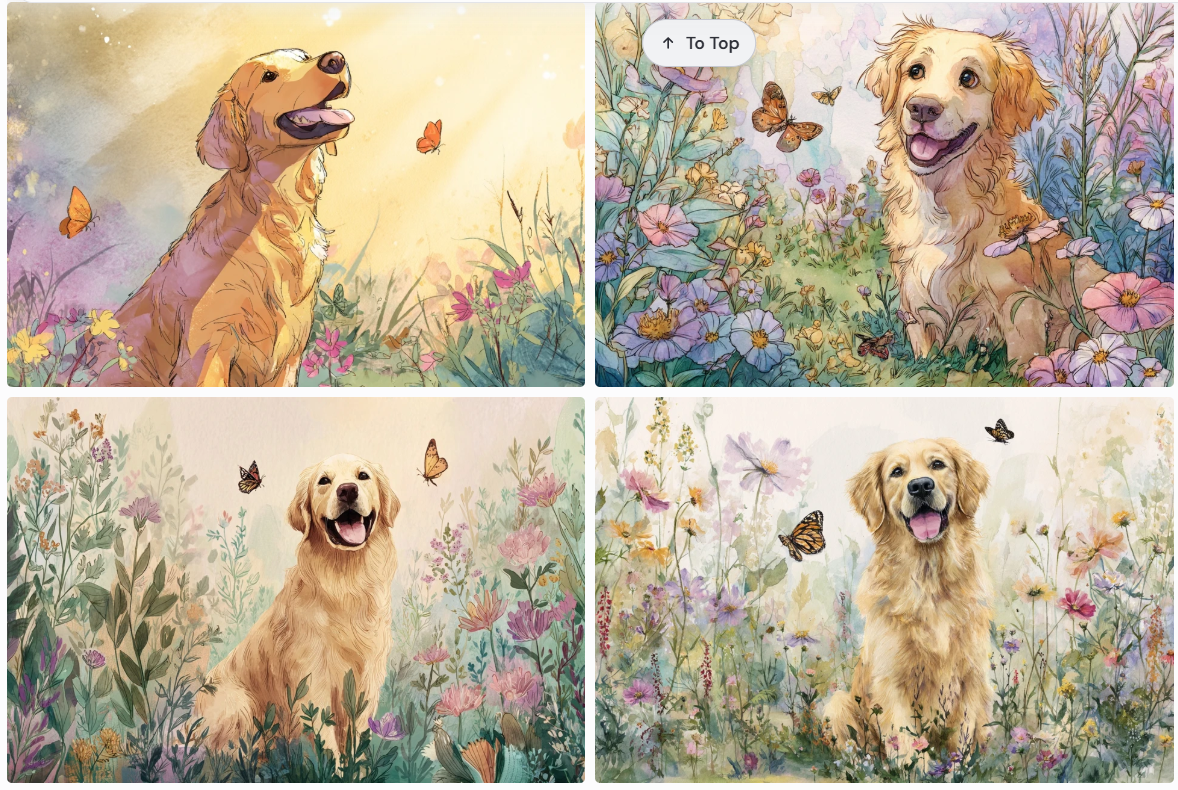 같은 "강아지"라는 대상이지만, 어떤 스타일과 디테일을 추가하느냐에 따라 완전히 다른 결과물이 나옵니다.