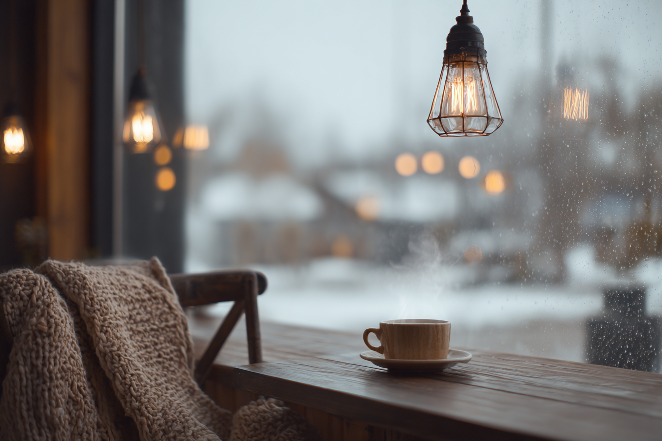 A cozy winter cafe interior, warm lighting from vintage pendant lamps, steaming coffee cup on wooden table near frost-covered window, soft snowfall visible outside, knitted blanket draped over chair, gentle bokeh effect, warm and peaceful mood, hygge aesthetic, soft focus photography style, golden hour indoor lighting, intimate and nostalgic atmosphere --ar 3:2