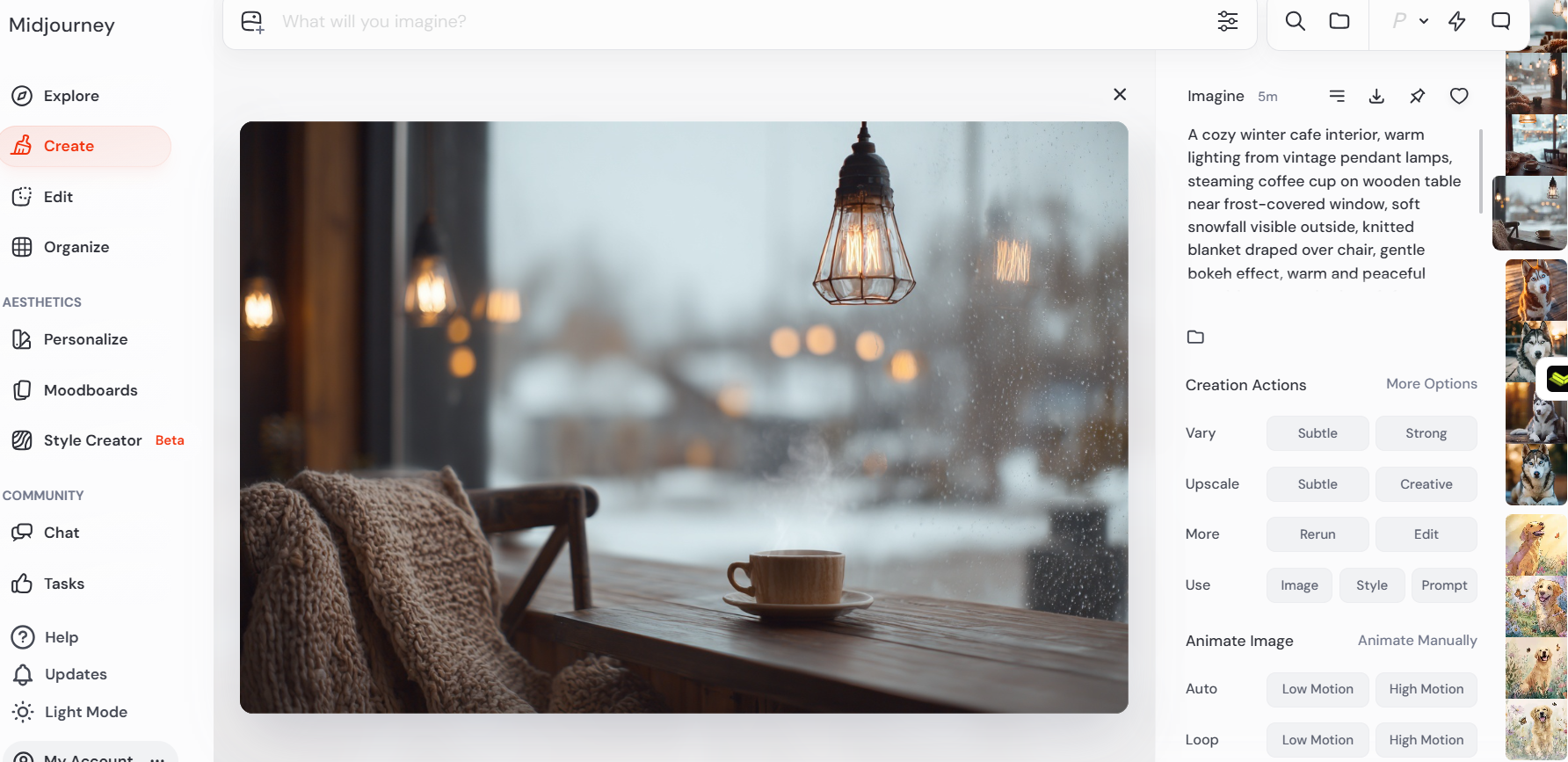 4개의 이미지 중 마음에 드는 이미지를 클릭하면, 위와 같이 화면 오른쪽에 프롬프트와 수정해서 재생성할 수 있는 creation Actions 기능과 Animate Image 기능으로 영상을 만들어 볼수도 있습니다. 이걸 어떻게 쓰느냐에 따라 결과물의 완성도가 크게 달라집니다