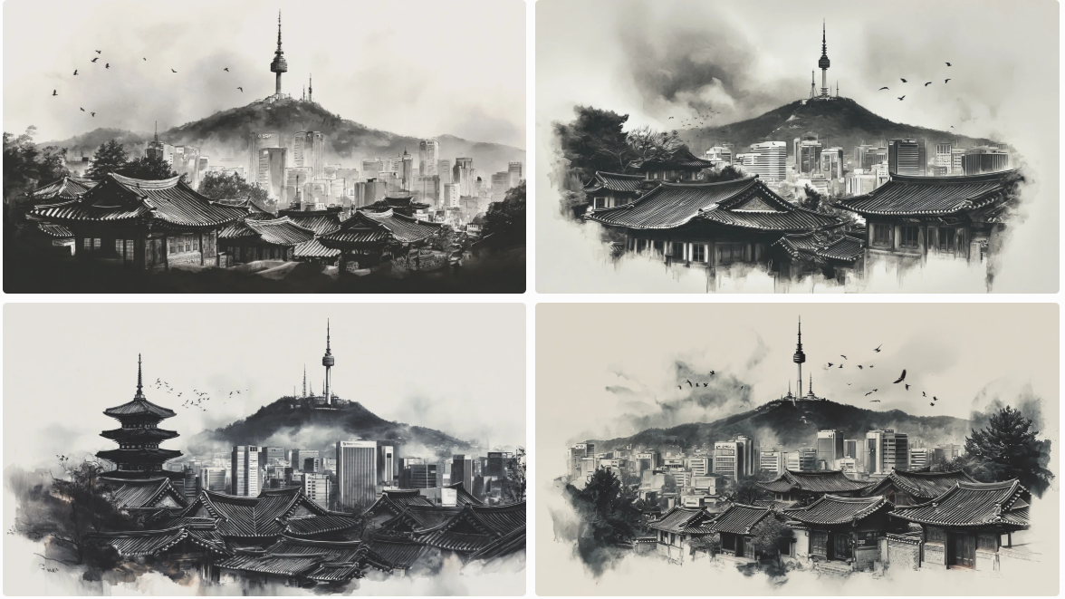 • 흑백 수채화 느낌으로 서울의 전통과 현대를 표현.
