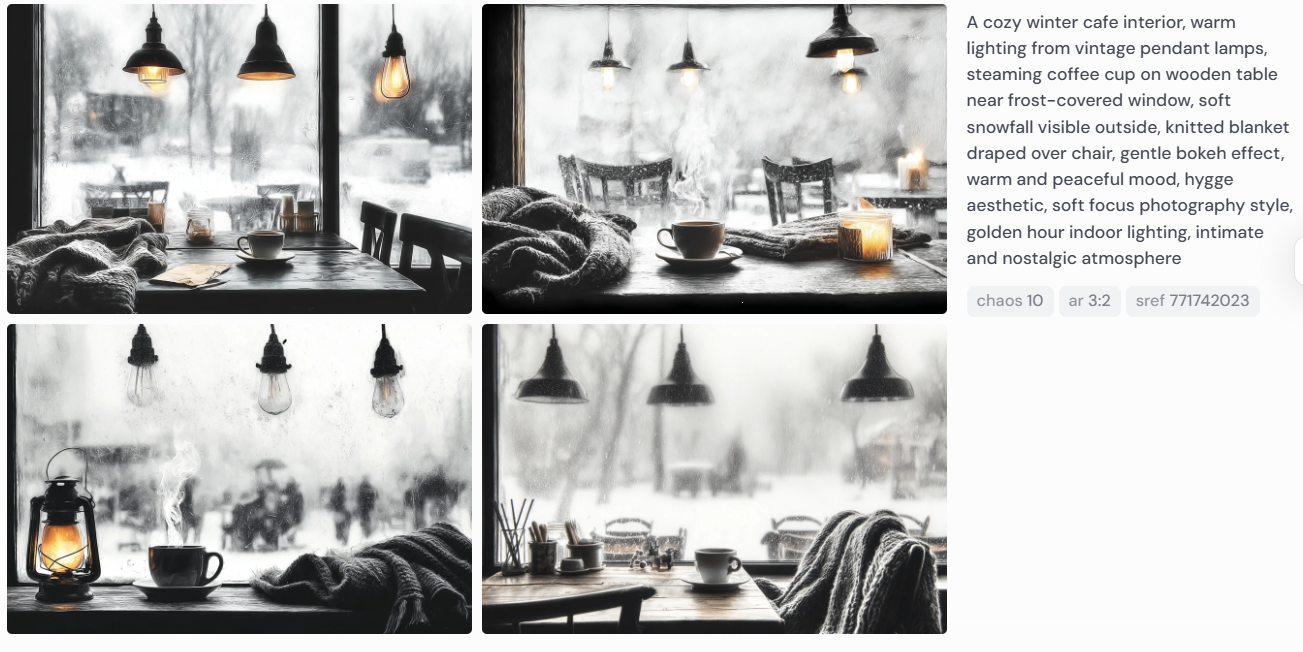 * 예: /imagine a cozy cafe interior --sref 771742023